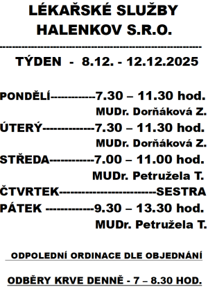 Lékařské služby Halenkov 8.12. - 12.12.2025